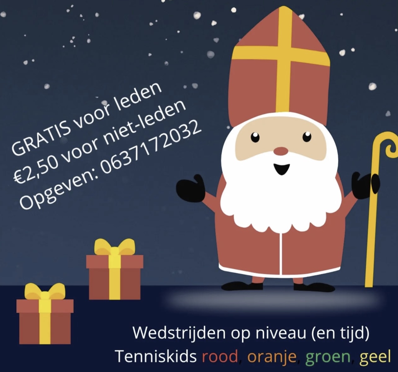 Doe mee met het Sinterklaastennis! Kom gezellig tennissen! Er worden wedstrijden op tijd gespeeld en de indeling is op niveau, zodat iedereen lekker kan meedoen. Tenniskids rood, oranje, groen en geel – allemaal welkom! Pak je racket en laat zien wat je kunt!
